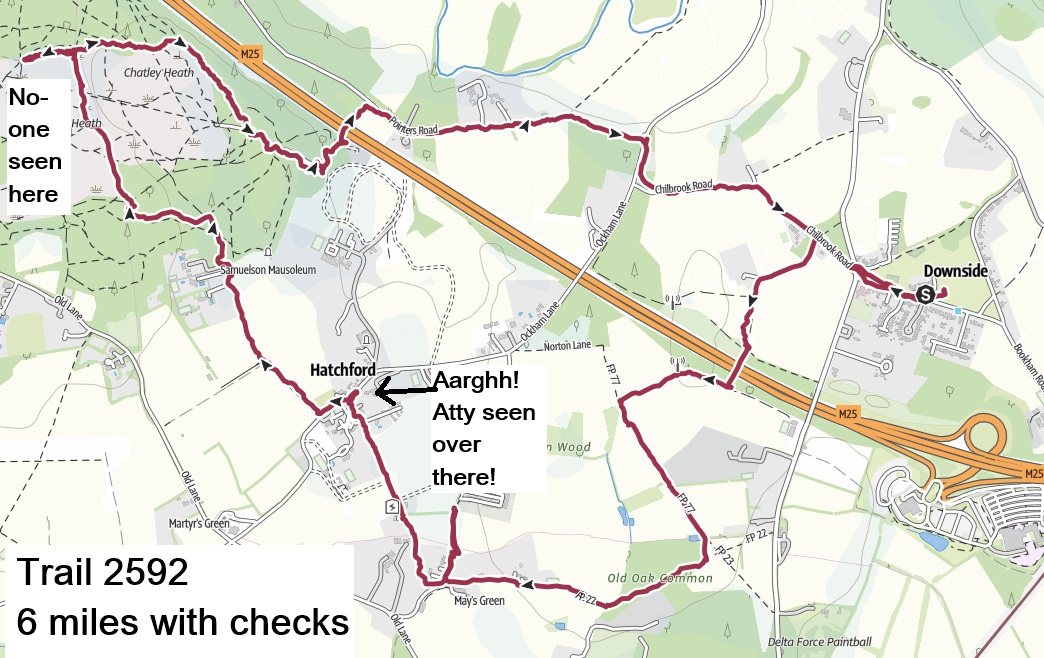 | rs2593 | 5 Oct ’25 | Missing In Action & Bigfoot | Horsell Birch | The Cricketers, Horsell Birch | Trail 2593 |
