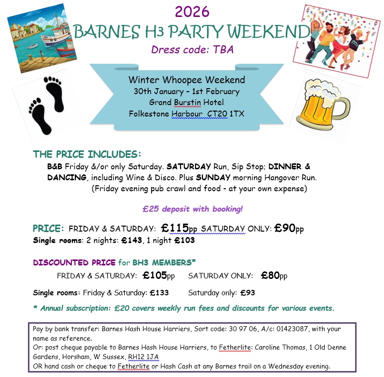 Other Hash Events Barnes H3 Winter Whoopie Weekend, 30 January - 1 February 2026 Download booking form here