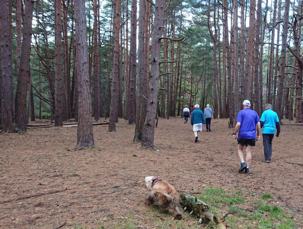 MiA clearly had her lesser half well under control. A sharp word here, a brief instruction to stay there while she did the difficult bits kept everything well under control. Lots of flour, a good clear trail. Out of the pub, across the road and immediately into the greenery. From there the trail maximised use of the heathland to stay away from tarmac and urban sprawl, heading over the Chobam road. Onto Horsell Common proper with enough twists, turns and checks to keep the pack guessing. On to that blasted area where the Martians landed. From afar came the echo of children screaming that the Martians had come back again. Hashers do look a bit odd to the uninitiated.