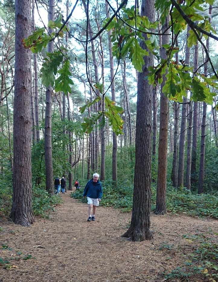 MiA clearly had her lesser half well under control. A sharp word here, a brief instruction to stay there while she did the difficult bits kept everything well under control. Lots of flour, a good clear trail. Out of the pub, across the road and immediately into the greenery. From there the trail maximised use of the heathland to stay away from tarmac and urban sprawl, heading over the Chobam road. Onto Horsell Common proper with enough twists, turns and checks to keep the pack guessing. On to that blasted area where the Martians landed. From afar came the echo of children screaming that the Martians had come back again. Hashers do look a bit odd to the uninitiated.