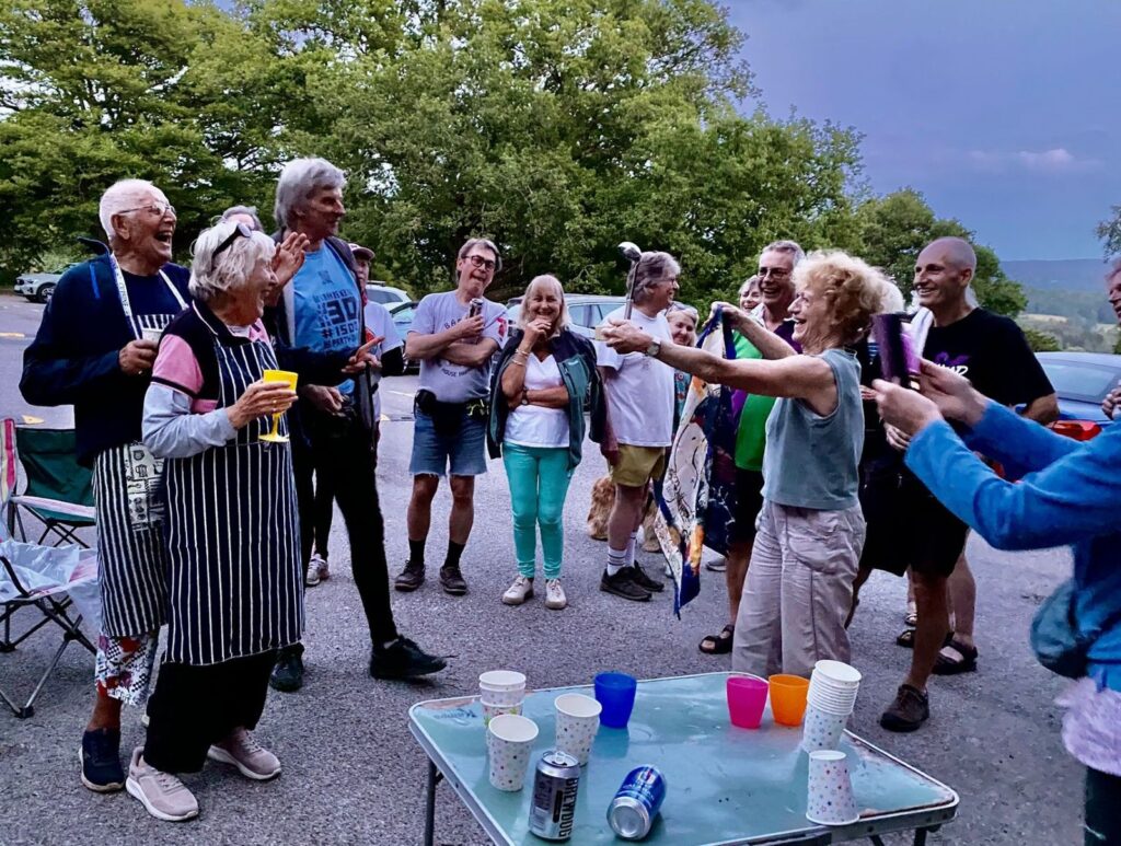 By the time we got back to the bucket and heavy drizzle had begun, so we gathered under a convenient tree at the insistence of Bigfoot, as usual. Down-downs were awarded to hares for an excellent run, and being starstruck by meeting Penelope Keith during the trail setting; the glow of celebrity bathing us all in its aura. Further down-downs were awarded to a few others, with the final DD being for a canine-related event, prompting a rendition of ‘The Dogs’ from yours truly.