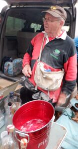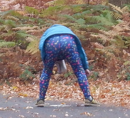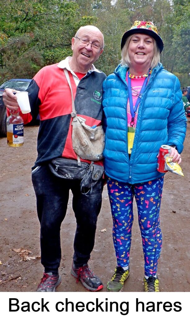 By the time we got back to the bucket and heavy drizzle had begun, so we gathered under a convenient tree at the insistence of Bigfoot, as usual. Down-downs were awarded to hares for an excellent run, and being starstruck by meeting Penelope Keith during the trail setting; the glow of celebrity bathing us all in its aura. Further down-downs were awarded to a few others, with the final DD being for a canine-related event, prompting a rendition of ‘The Dogs’ from yours truly.