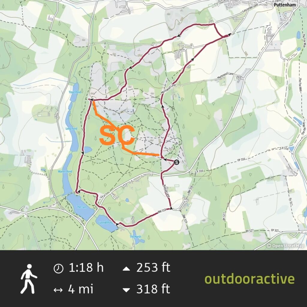 Fortunately, he left dear Marion behind to direct the pack on the On Out, waving loosely in the general direction of three or four wooded areas. We jogged / ran / stumbled 400 metres west until taking a northerly bearing up towards Puttenham and passing Church Croft to the east. From Lascombe Farm we bore north-east to Little Lasccombe and then hooked west onto the North Downs Way, crossing the unwooded sections of Long Bottom and getting somewhat lost before Hillbury on Puttenham Common. We endured many false trails before navigating back from a westerly point to the car park.